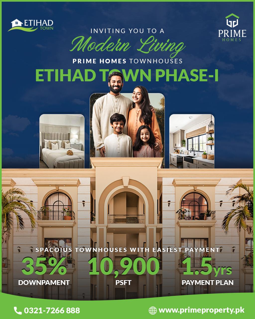 Located in Etihad Town Phase-I, Prime Homes provides easy access to main roads, commercial areas, schools, and healthcare facilities. Every townhouse is built with quality materials and attention to detail to ensure durability, comfort, and aesthetic appeal.